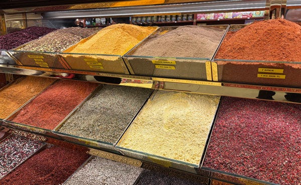 As we were wandering the markets of Istanbul, I was struck by the massive piles of spices sold in bulk, probably still displayed in much the way they would have been centuries ago when exotic tastes and smells from China and India were brought on ships and traded into the European market.