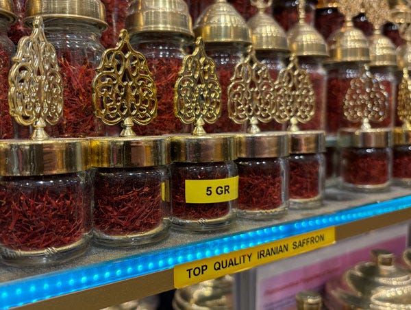 In one stall, I noticed a beautiful display of saffron. Most of it originated in Turkey, but there was also a shelf with more expensive saffron labelled as “Top Quality Iranian Saffron.”