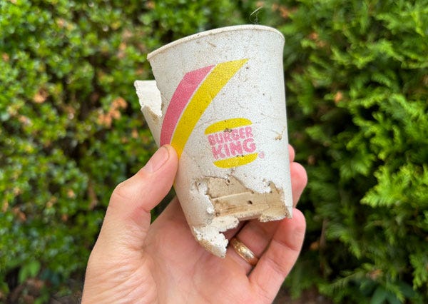 I stumbled upon a vintage Burger King styrofoam cup. Parts of it were missing, but I suspect that was more a function of something hitting it or an animal chewing on it than the styrofoam decomposing, as it was otherwise in very good shape.