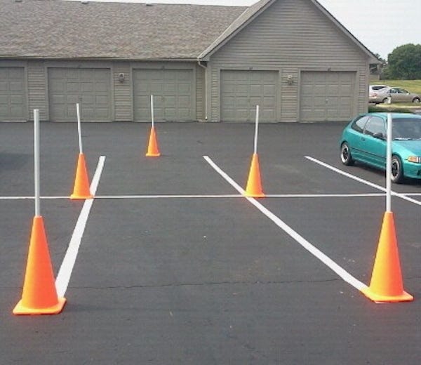 Under an instructor’s supervision, the applicant must drive through the cones, around the cone at the end, and then reverse through the course and end up back at the starting line. In order to pass, none of the cones can be disturbed.